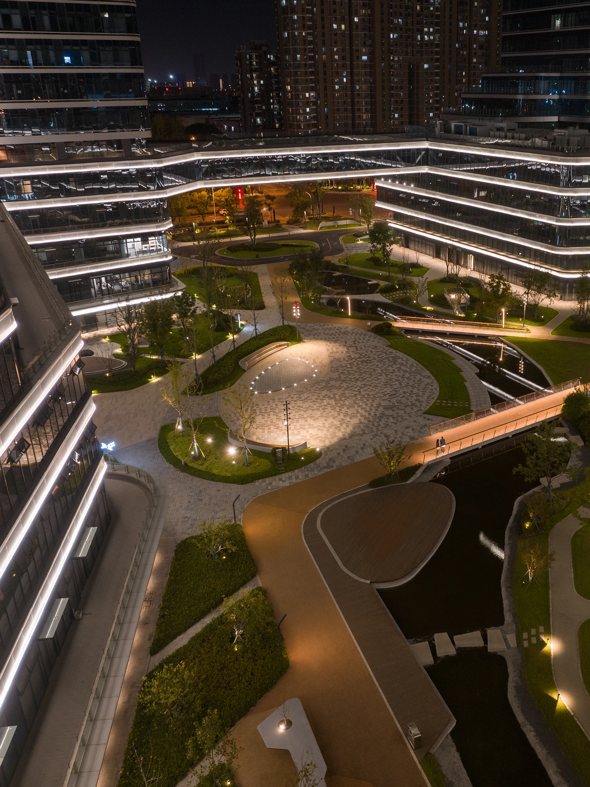 元创公园整体建筑彰显 “现代、大方、专业、精致”的气质,建筑风格引入杭州茶园的形象元素,四座塔楼互相联通,还有多层次的叠加空间,环式独立内院,中心超大景观花园。园区打造新一代创新商务生态圈,营造杭州本土江南地域特色邂逅新加坡花园城市景观的精致空间。TS团队在灯光上让连续光围绕着建筑的边际不断循环,营造园区的科技灵动之美。